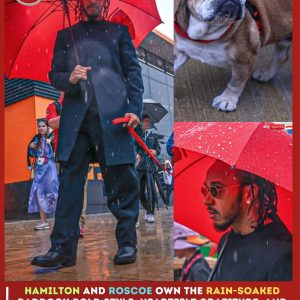 Rainy-Day Red Carpet: As torrents swept through the circuit, Lewis swapped his usual racewear for a bespoke black trench coat and signature red umbrella matching Roscoe’s own…