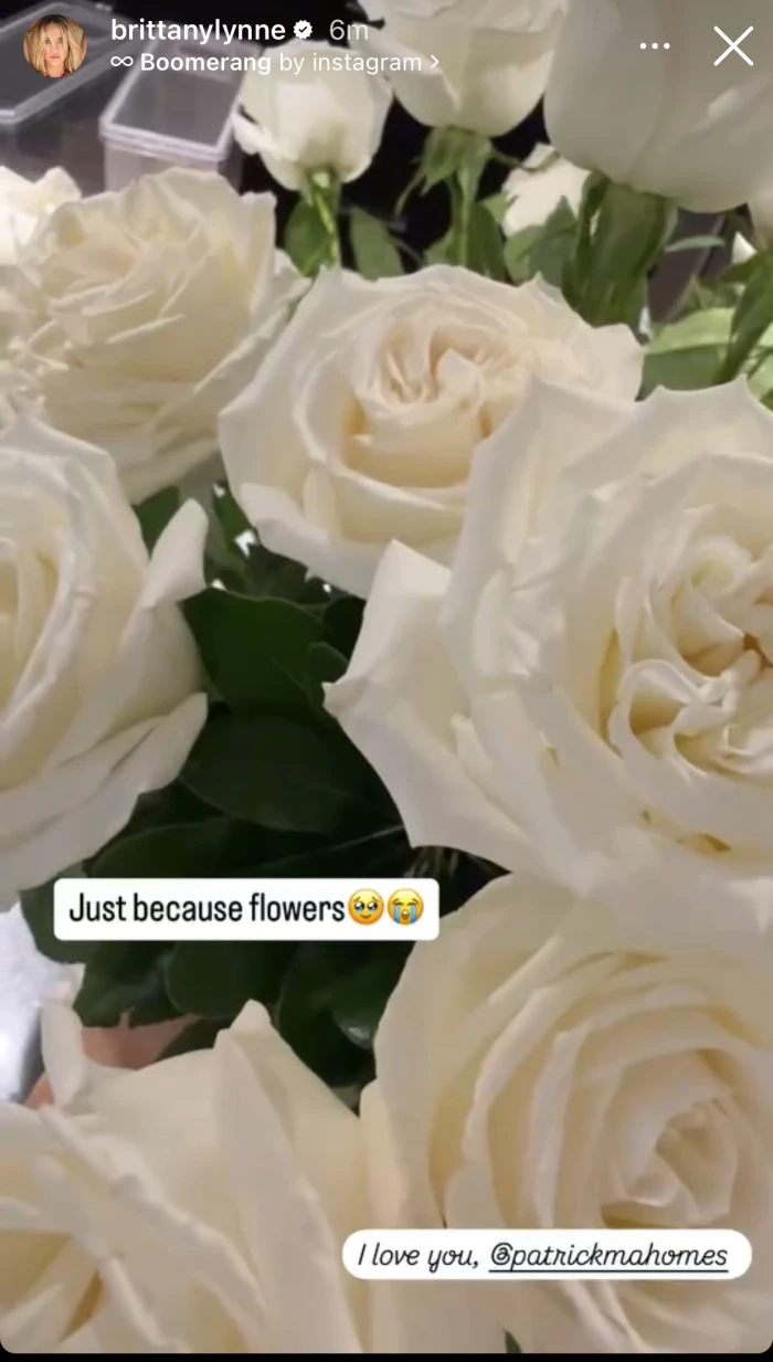 Brittany, who is pregnant with the couple’s third child, shared a heartfelt moment on her Instagram Stories that brought her to tears. “Just because flowers 🥹😭.